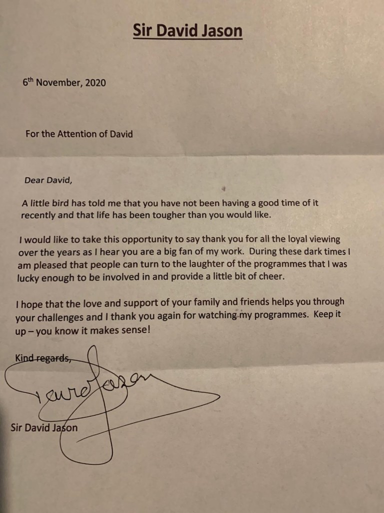 When my father-in-law was diagnosed with a terminal illness, Wes told one of his colleagues how his dad was spending most of his time enjoying old British comedies. This colleague had a connection to David Jason’s agent and arranged for this letter and photo to be sent. It was an incredibly kind gesture, and arrived while my father-in-law was still well enough to appreciate it. He was really touched.