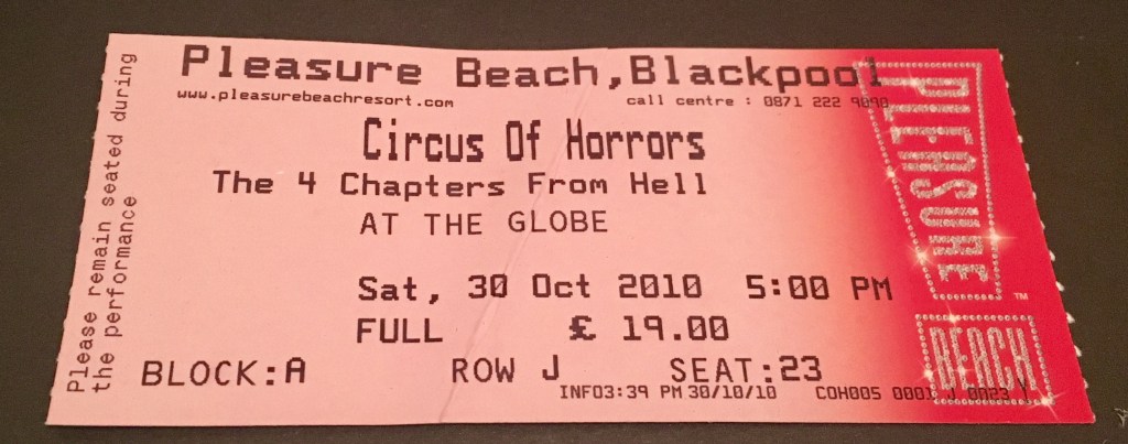 Comment: Our second holiday to Blackpool happened to coincide with me receiving my job offer from HHG. I had the call from them on the coach on the way there, and then upon arriving we immediately saw adverts for the Circus of Horrors and knew we had to celebrate my new job by buying tickets. It turned out to be surprisingly appropriate…
