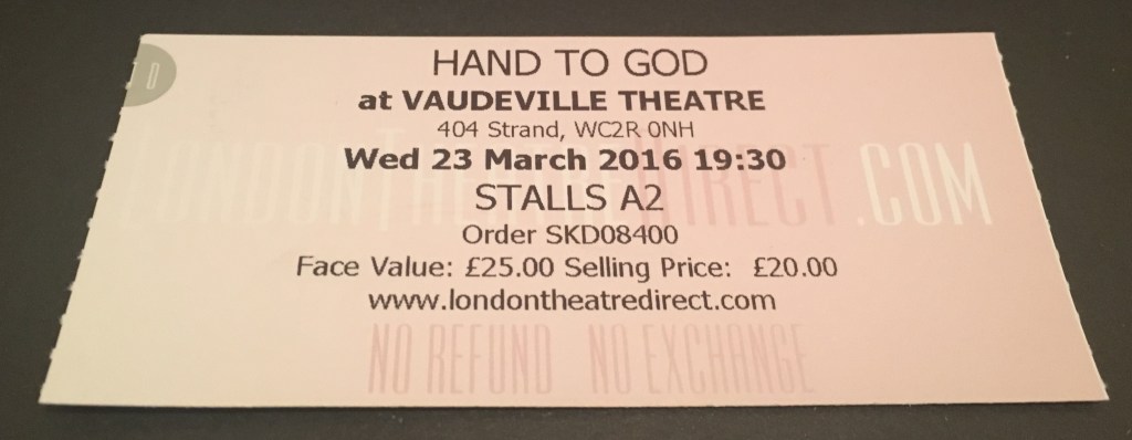Comment: Since we were already traveling to London to watch The Book of Mormon, we thought we’d try and fit something else in while we were there. Hand to God didn’t meet the musical criteria, but it did have a deranged puppet, and seemed to fit nicely with the somewhat religious theme of the weekend. It was a bizarre tale about a Christian ministry puppet who seemingly becomes possessed by the devil. We rather enjoyed it.
