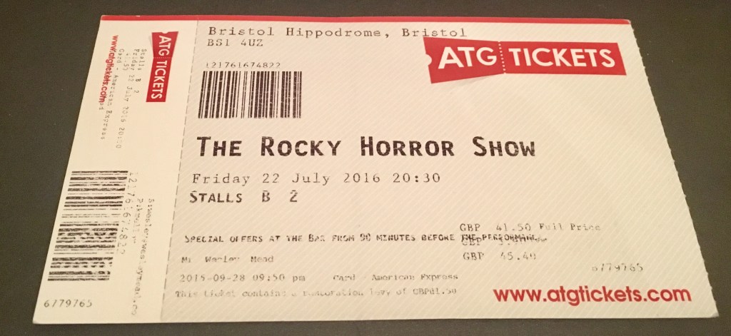 Comment: Considering how many times I’d watched the Rocky Horror film, it was surprising I’d never made it to a live performance before. The whole thing was great fun, and the costumes in the audience were amazing. I wasn’t brave enough to dress up properly, but I did wear fishnet tights with shorts and a “Don’t Dream It, Be It” t-shirt.