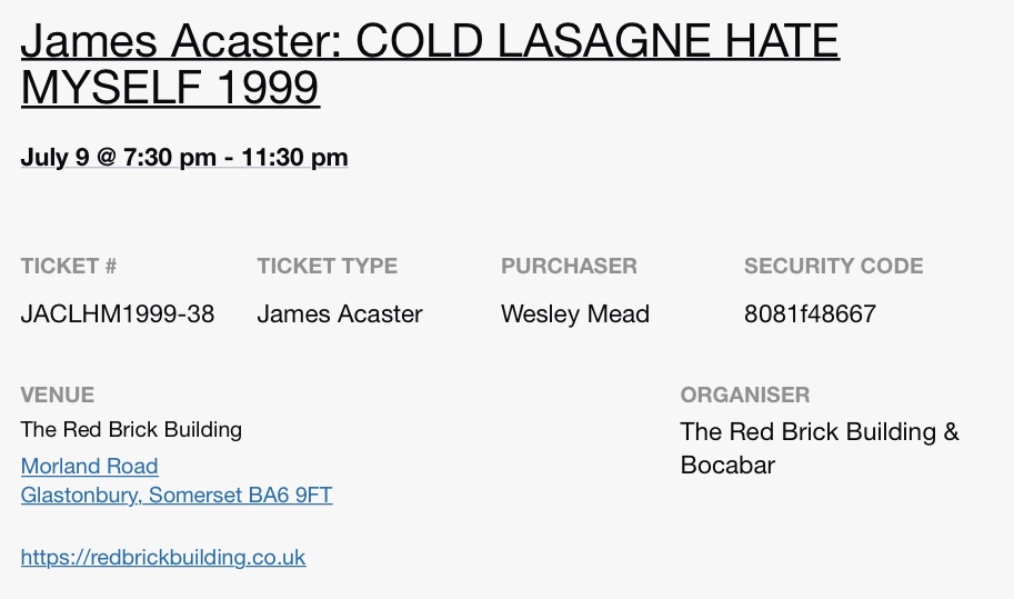 “One time I bought a lasagne from the supermarket, heated it up in the oven and ate a bit of it and it wasn’t very nice so I put it in the fridge because it felt wrong to dump a whole lasagne in the bin and then later on I ate a spoonful of the cold lasagne because I was drunk and it was absolutely delicious. It was 4am. I then changed the name of a WhatsApp I was a part of to COLD LASAGNE HATE MYSELF 1999 because I had been thinking a lot about how 1999 was the best year of my life and also about how much I hate myself sometimes. The next day I was asked to name my new show. Come along.“