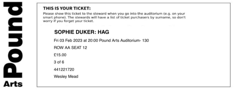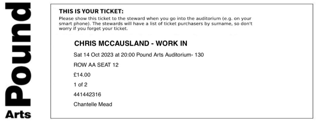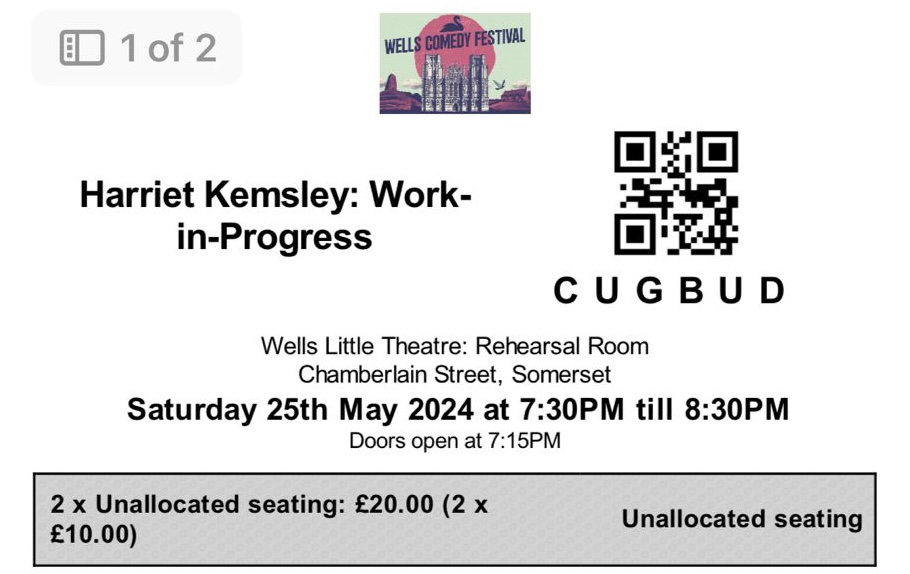 Comment: The show was really funny, and the audience were much better than they were for the last comedian we saw at the Pound (Harriet Kemsley). After Sophie finished her set she invited people to come back after an interval so she could try out some new material, so that was a nice added bonus.