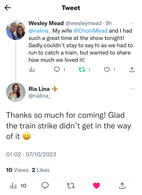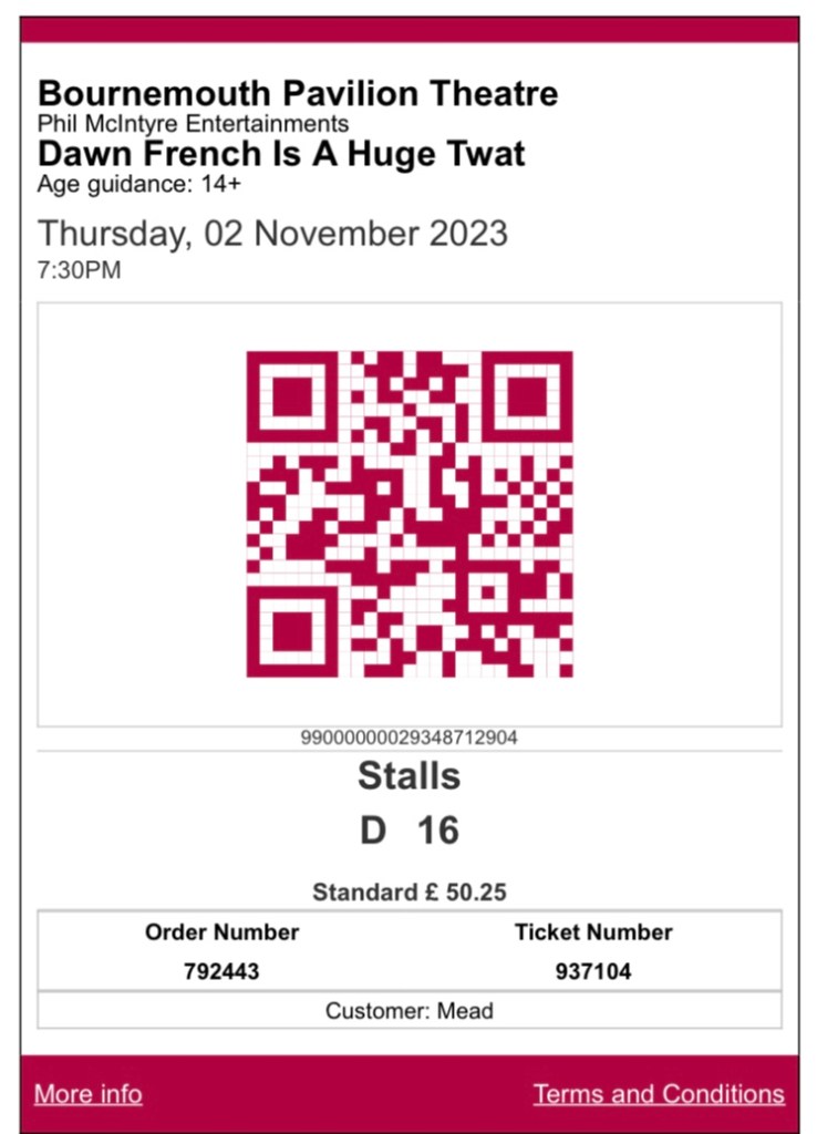 Comment: I’d bought mum these tickets for Christmas 2022. It never even crossed my mind that less than 5 months later she’d be gone. I went to the show by myself, as it didn’t feel right for anyone else to take her place – the tickets were only bought because she was the Dawn French fan. She would have loved it. I’m just so glad she died while looking forward to it, without realising she’d never actually go. I stayed composed through the show, and cried all the way home.