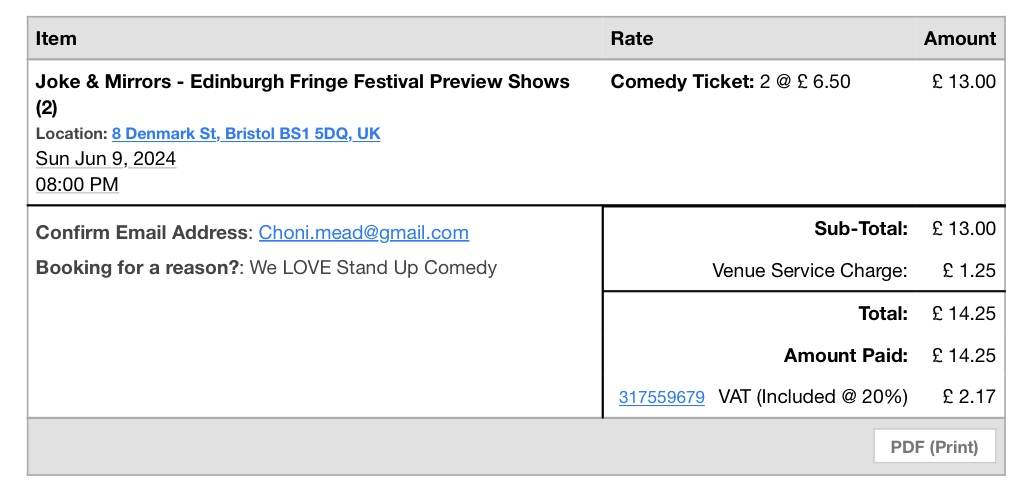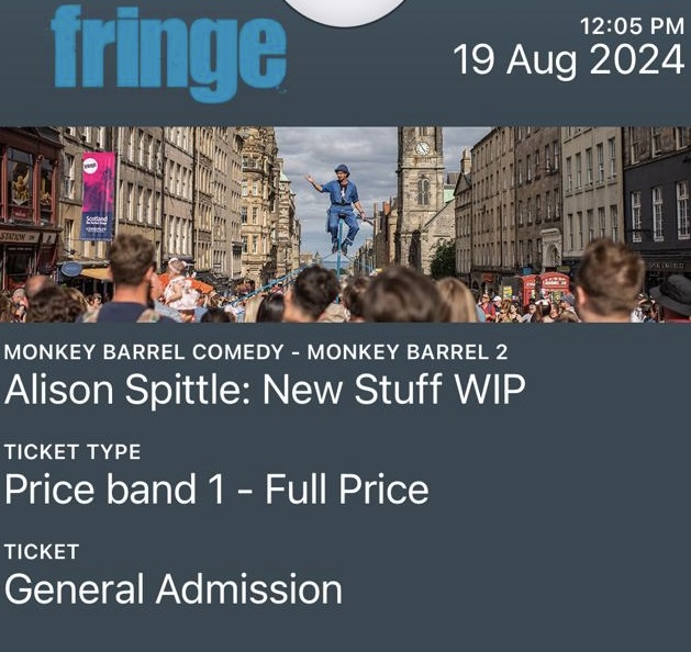Comment: I loved Olga’s last show a lot, but this one just didn’t really work for me. I found it too difficult to follow, with each story requiring a lot of explanation before the punchline worked. I would still see her next show though. Jordan’s show used a lot of the same content that we saw at Wells Comedy Fest in 2023, but we enjoyed it then, and we enjoyed it now. He asked if anyone in the audience was going to the Fringe, and we put our hands up. He said to message him and he’d put us on the guest list to see his finished show there for free. We did message afterwards and said how nice his offer was, but that we were happy to pay. He insisted though. It’s a shame we didn’t actually have time to take him up on it, as our Fringe schedule was jam packed.